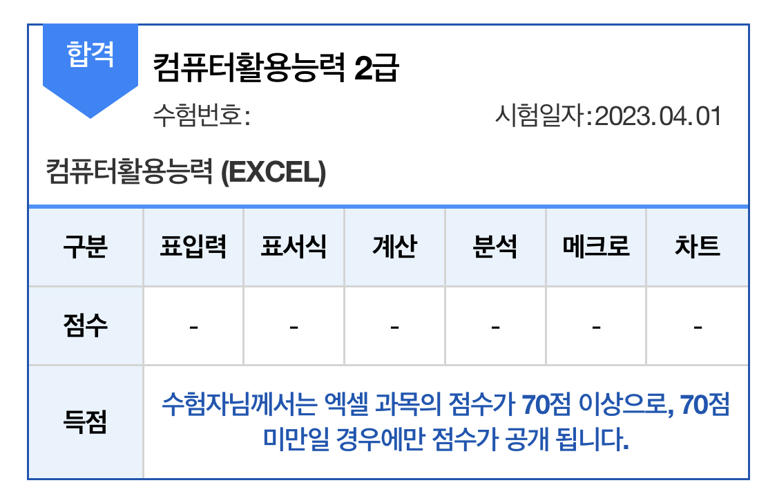 합격했습니다! 득점 부분을 보시면 70점 이상이라 세부 점수가 공개되지 않았네요.