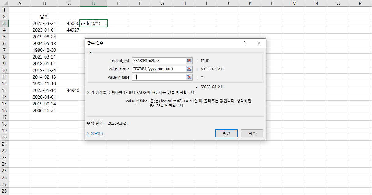 B3( 2023-03-21 )값의 연도( year(B3) )가 2023인가?