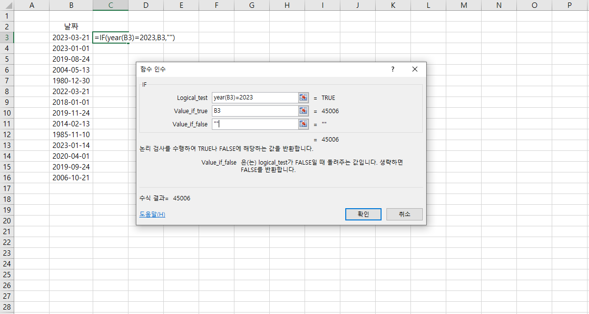 이후에 참값에 B3를 적어줬을 때 값이 2023-03-21이 아닌 45006이 나오는데, 날짜 데이터가 숫자로 변환된 값입니다.