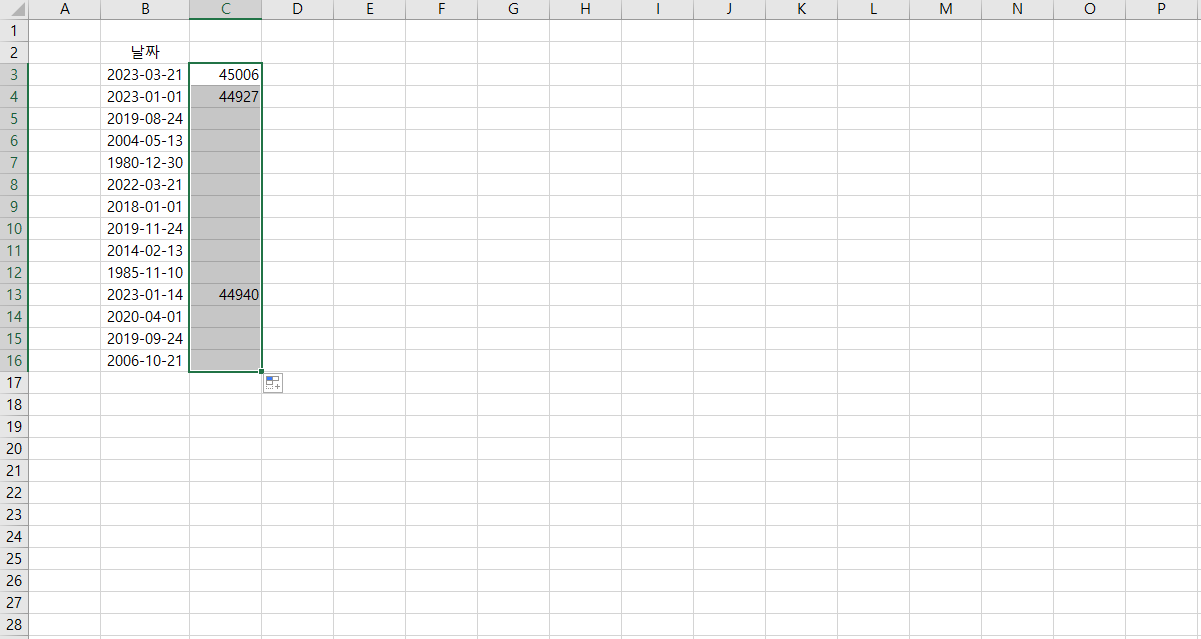 함수를 입력하고 드래그해보면 숫자 값이 날짜데이터로 다시 바뀌는 것을 알 수 있습니다.