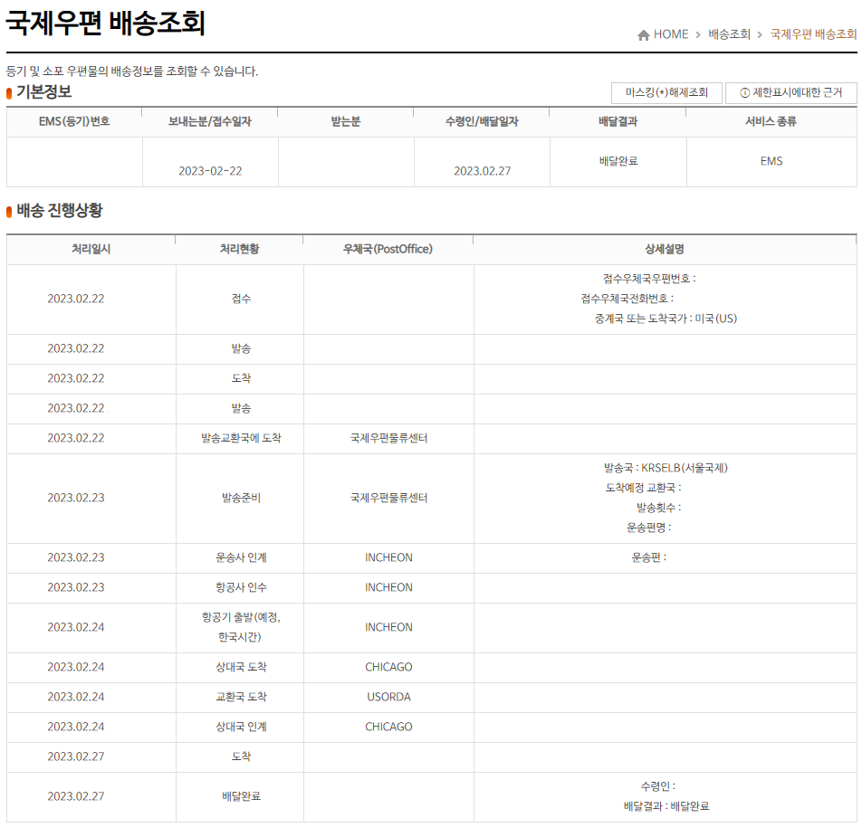 저는 미국으로 보낸거라 EE _ _ _ _ _ _ _ _ _ KR의 형식으로 13자리 코드를 부여받았고, 우체국의 인터넷 행방정보를 통해 배송추적까지 확인할 수 있었습니다.