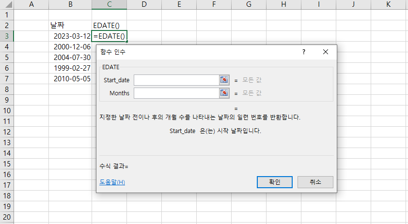 EDATE함수는 인수가 2개가 필요합니다.