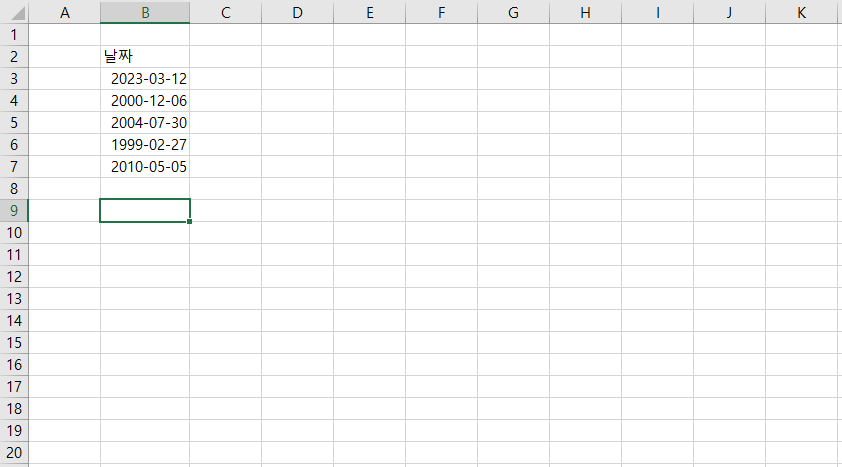 오늘은 엑셀 데이터 작업 중에 날짜가 숫자 값이 되었을 때 되돌리는 작업을 해보겠습니다. 우선 기본적으로 날짜 데이터들을 불러옵니다. 2023년의 날짜만 숫자로 변환하겠습니다. 불러온 날짜