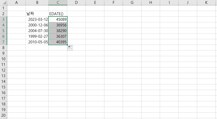 EDATE 함수를 적용해주고 드래그하면 숫자 값이 나오는데요.